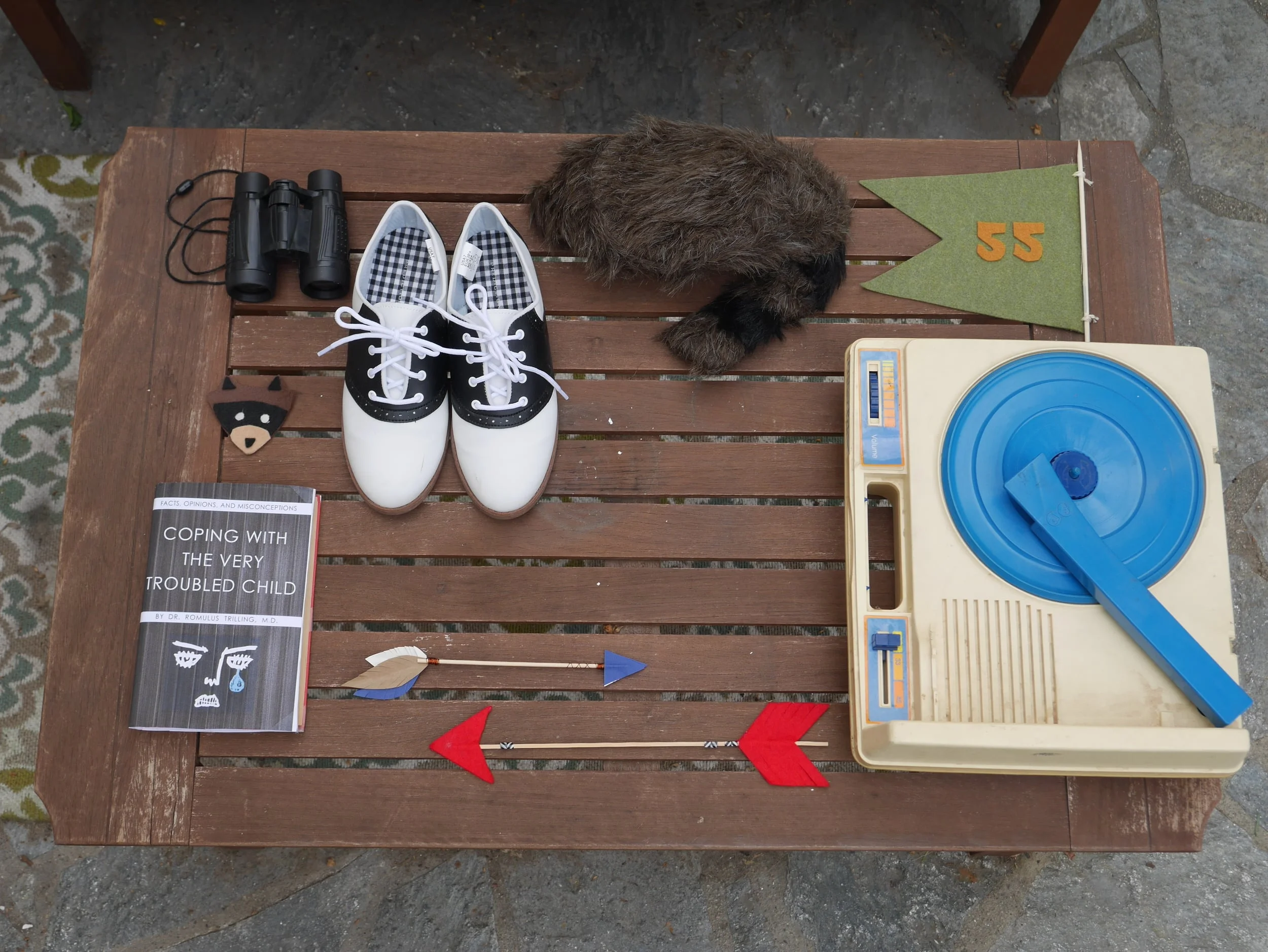 Props: Felt flag and raccoon patch, arrows, book cover printed and wrapped around another book. Record player found outside my friends house, binoculars, shoes, and raccoon hat ordered online.