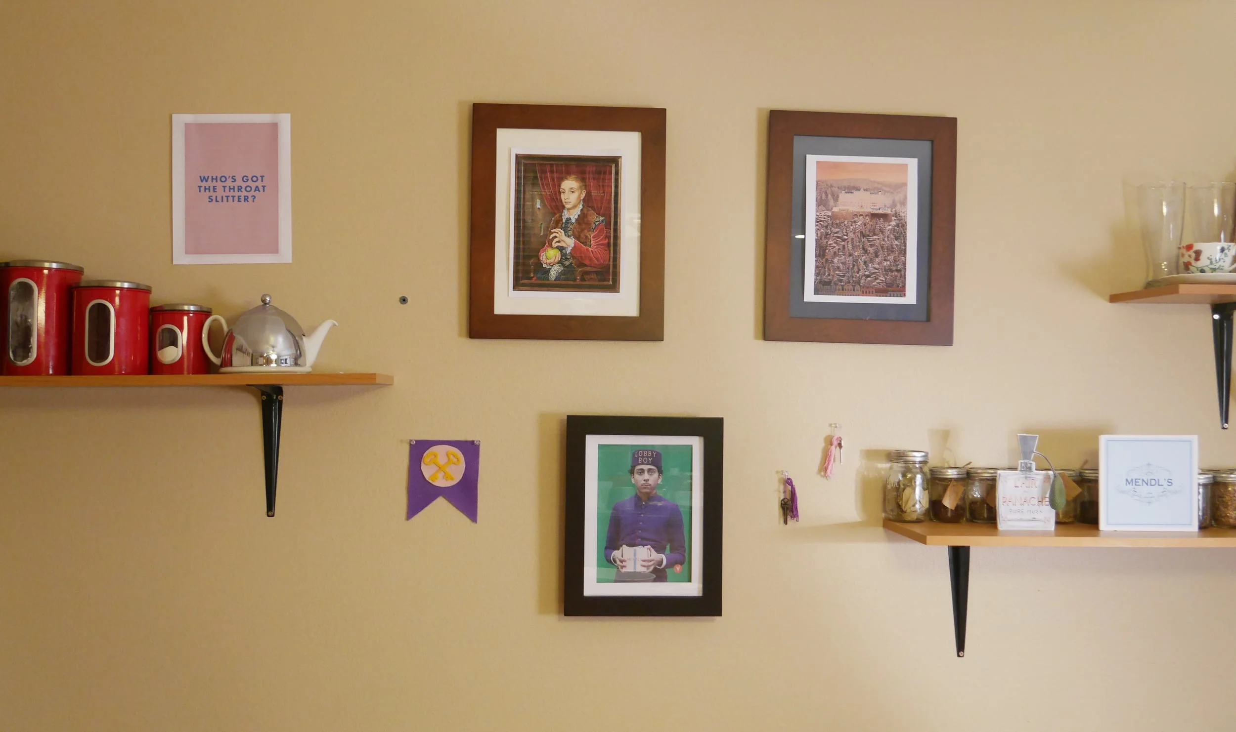 I decided to to the kitchen like The Grand Budapest Hotel, the details included a lot of quotes and printed images, Mendels boxes, cake stands, perfume, and keys.
