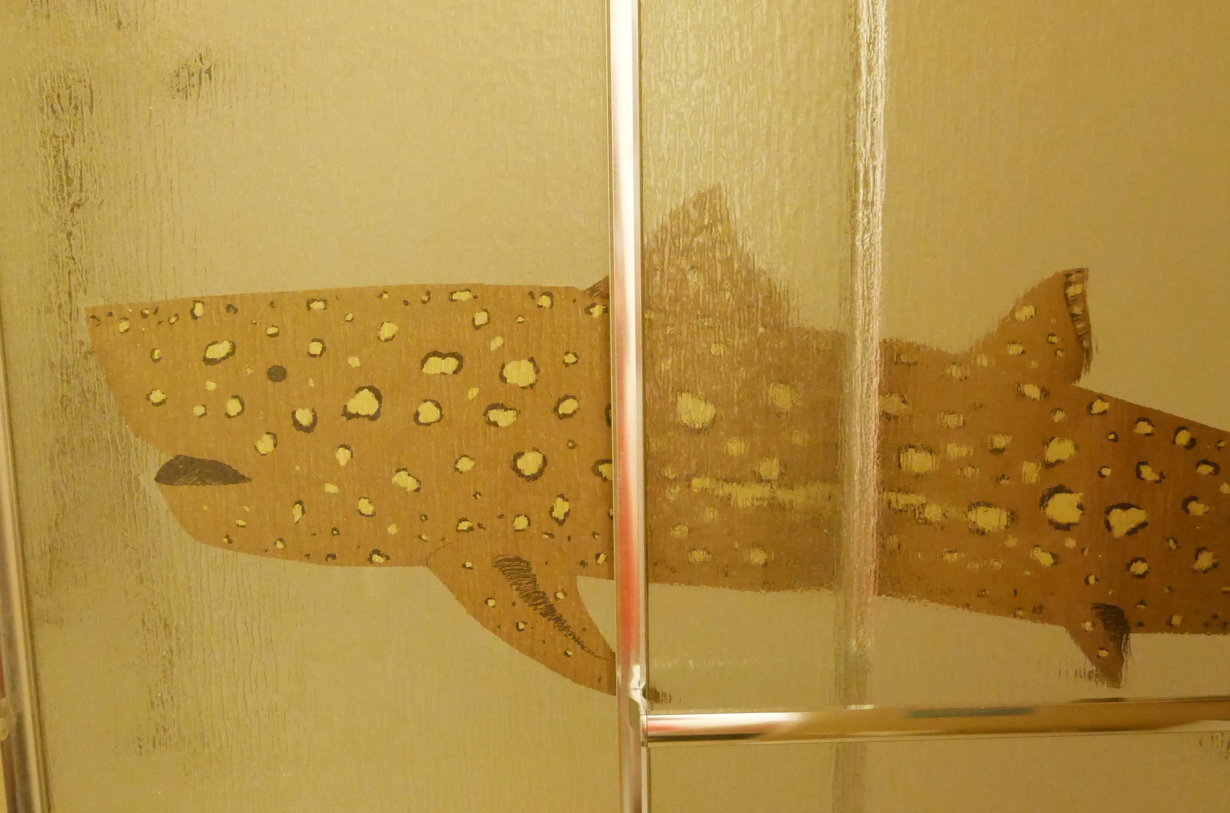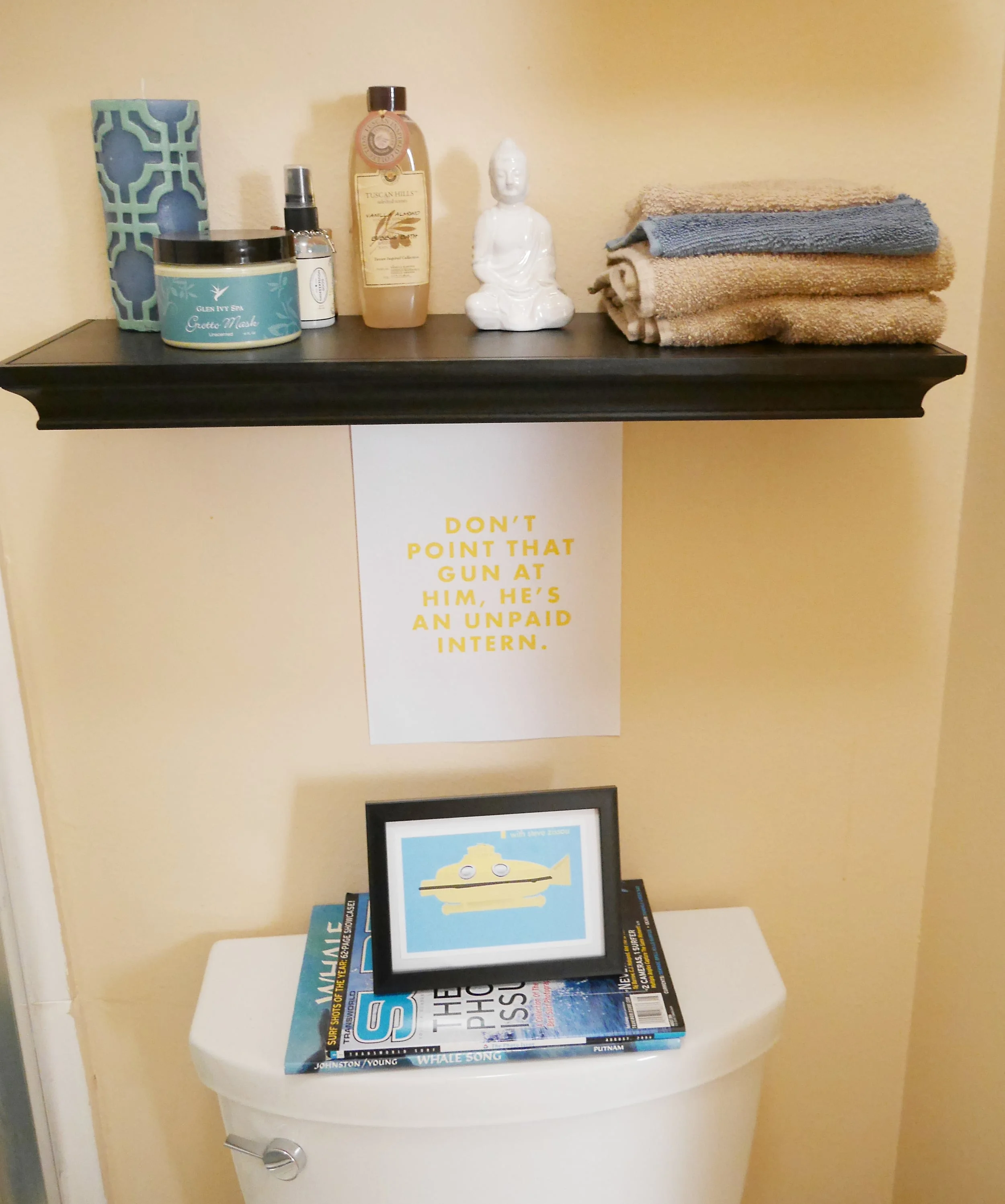 Naturally, I had to do the bathroom inspired by The Life Aquatic with Steve Zissou. I printed quotes, images, created dynamite, and of course a leopard shark.